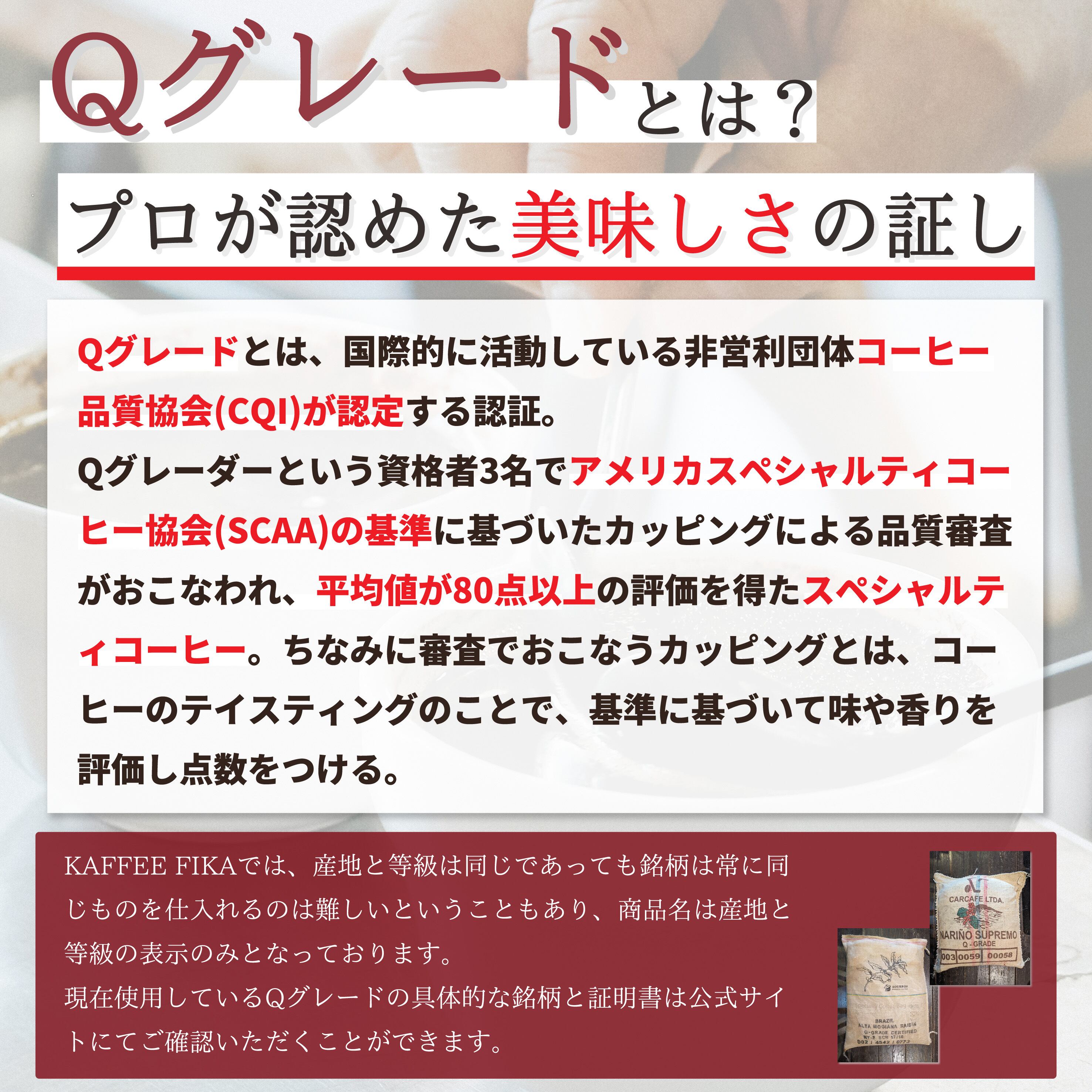 配合(メキシコ SHG Qグレード、コロンビア スプレモ Qグレード、グアテマラSHB Qグレード、ブラジル サントス No.2 Qグレード、インド プランテーション A、インドネシア WIB-1)